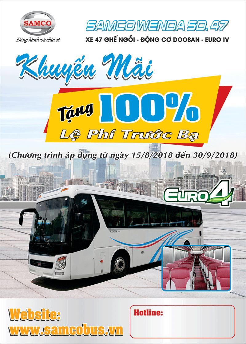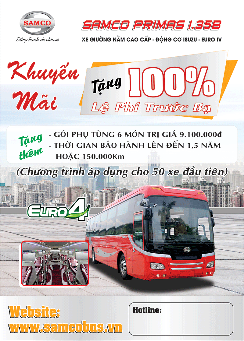 Từ ngày 01/06 đến hết ngày 31/07/2018, SAMCO hân hạnh dành tặng Quý khách hàng chương trình khuyến mãi đặc biệt: TẶNG 50% Lệ phí trước bạ cho khách hàng khi mua các dòng xe khách 29/30/34 chỗ ngồi Allergo Si.29, Felix Ci.29/34, Felix Gi.30/34 – 35 giường nằm Primas I.35B – xe limousine.