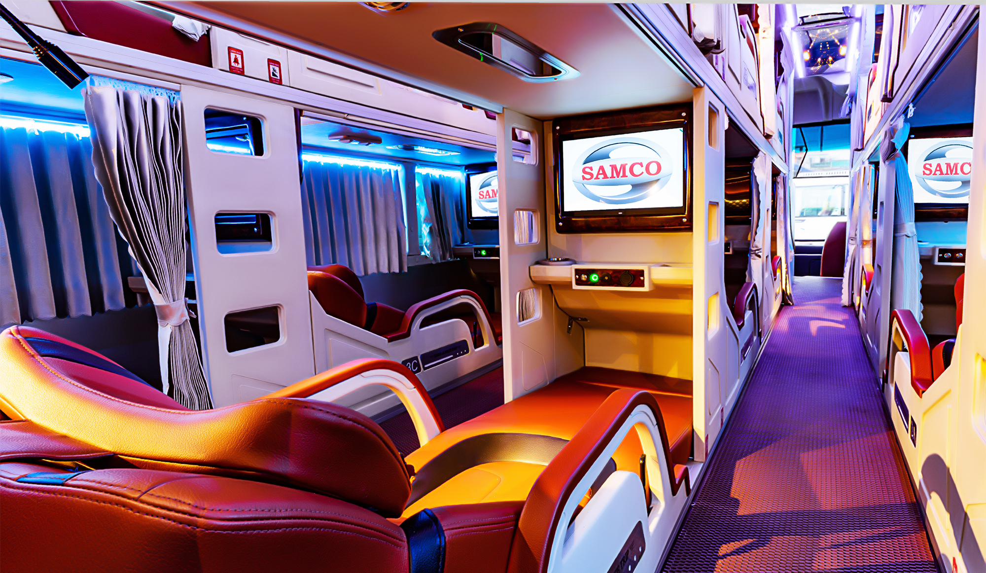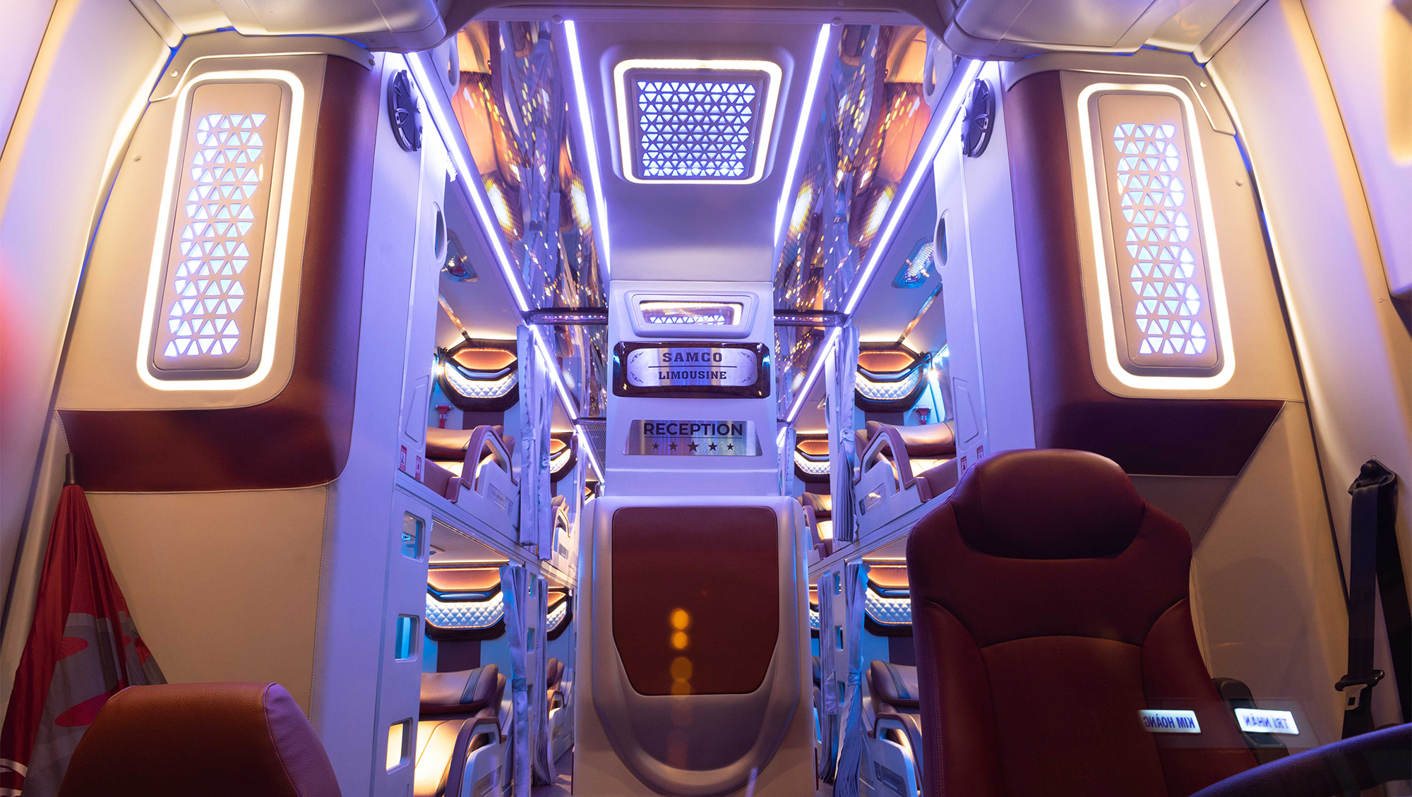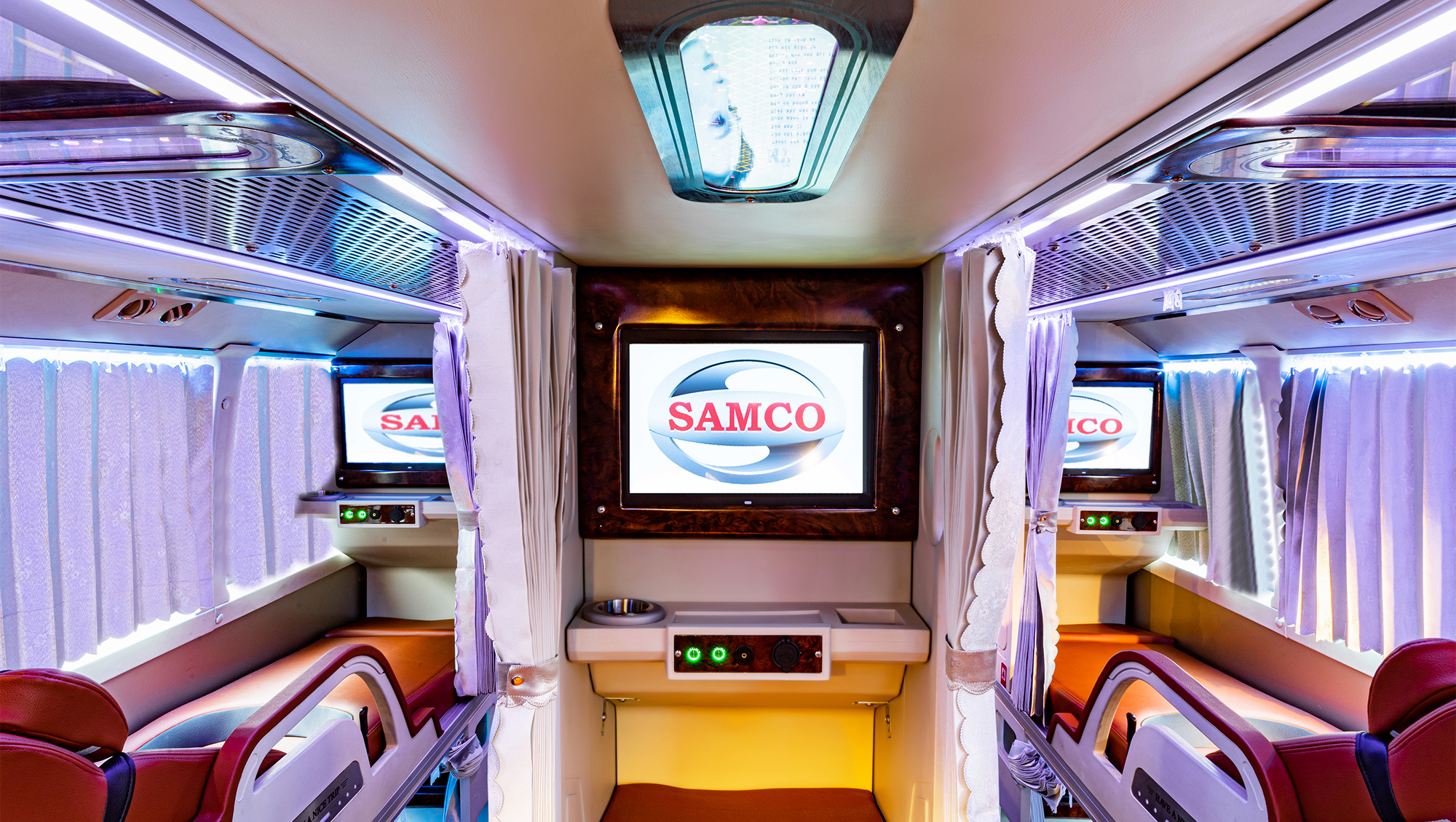 Nội thất Samco Primas Limousine sang trọng, bố trí 34 giường vip với mọi trang bị tiện nghi như LCD với thẻ nhớ 32G chứa nhiều chương trình giải trí hấp dẫn, tai nghe, đèn đọc sách, cổng sạc điện thoại và rèm riêng biệt...mang đến cho khách hàng một trải nghiệm hoàn hảo cho hành trình.