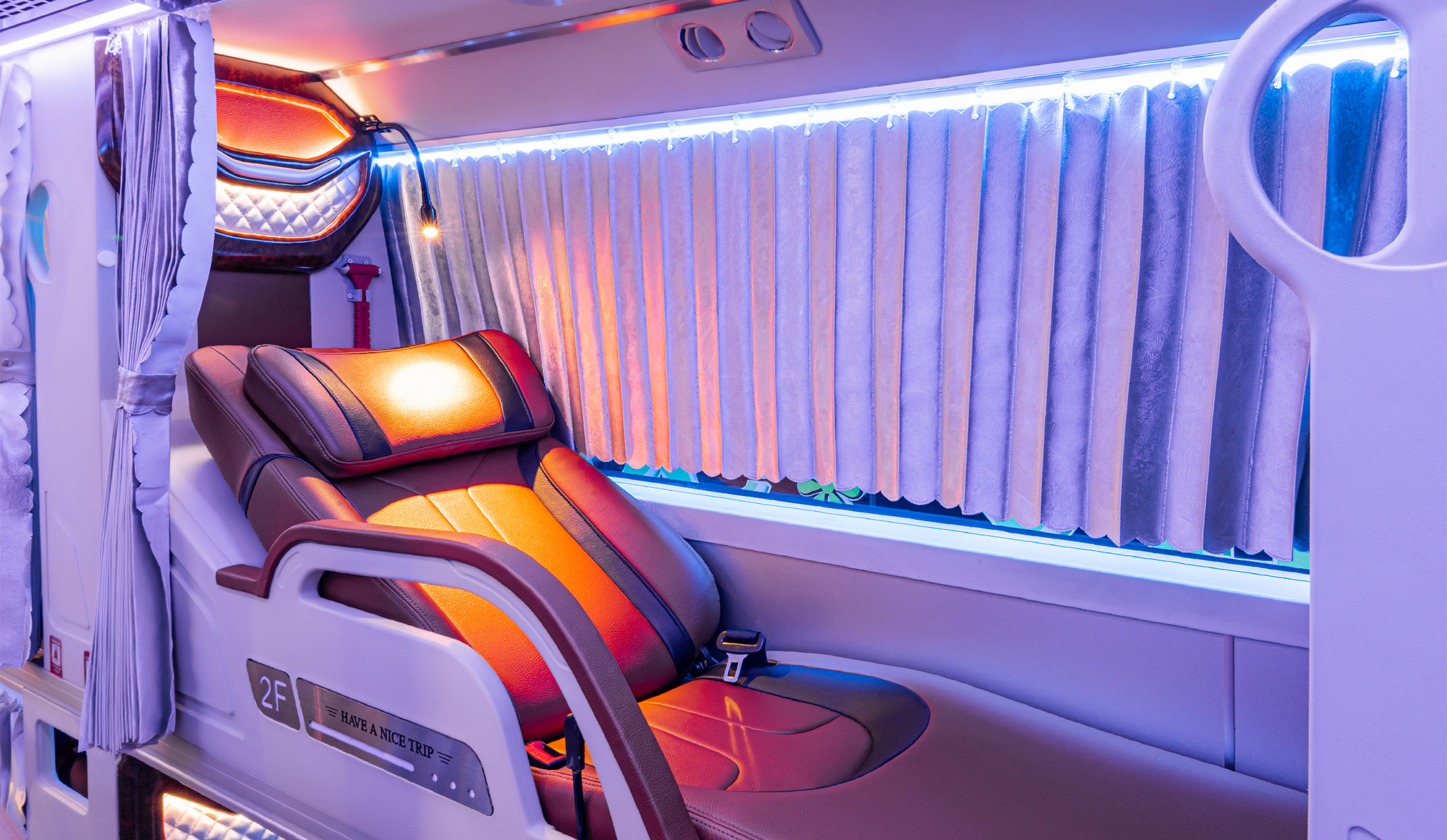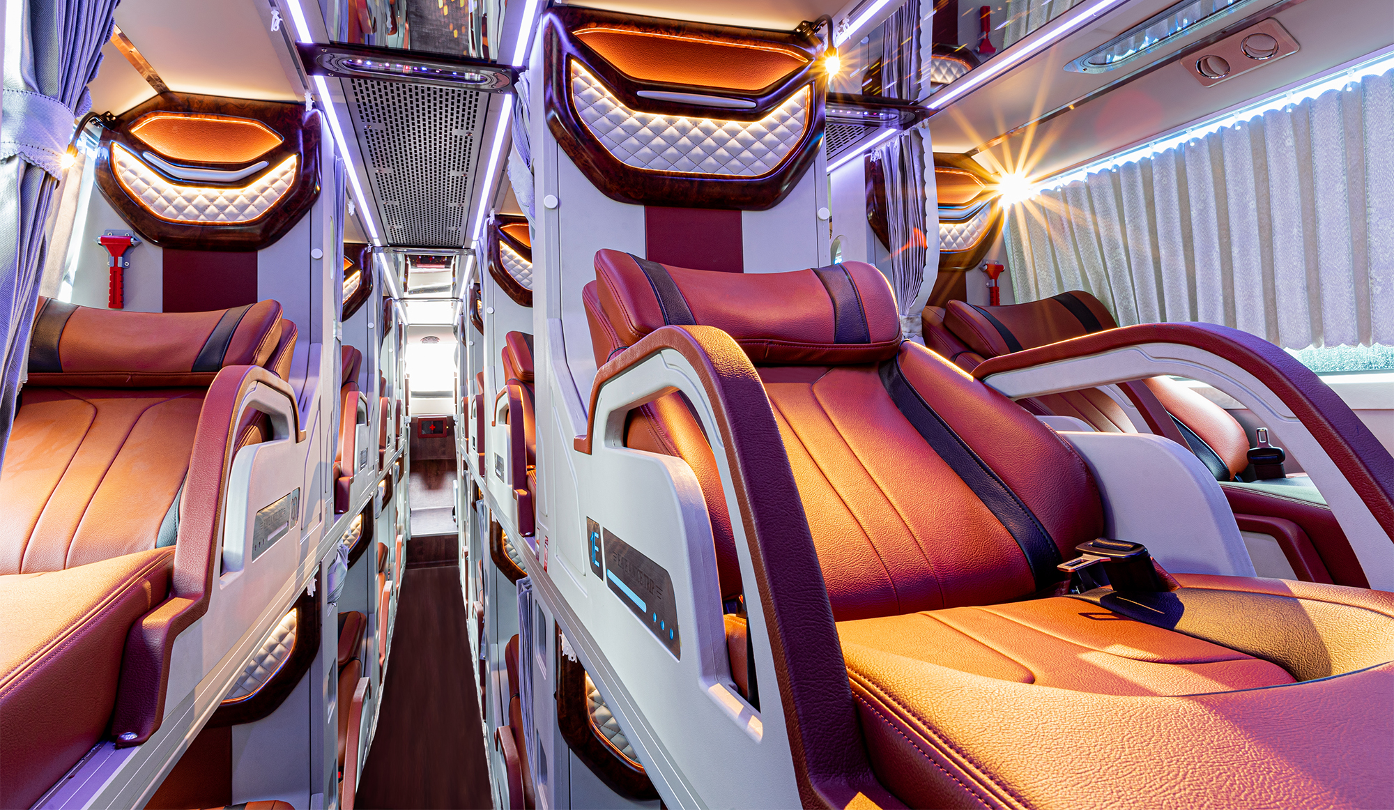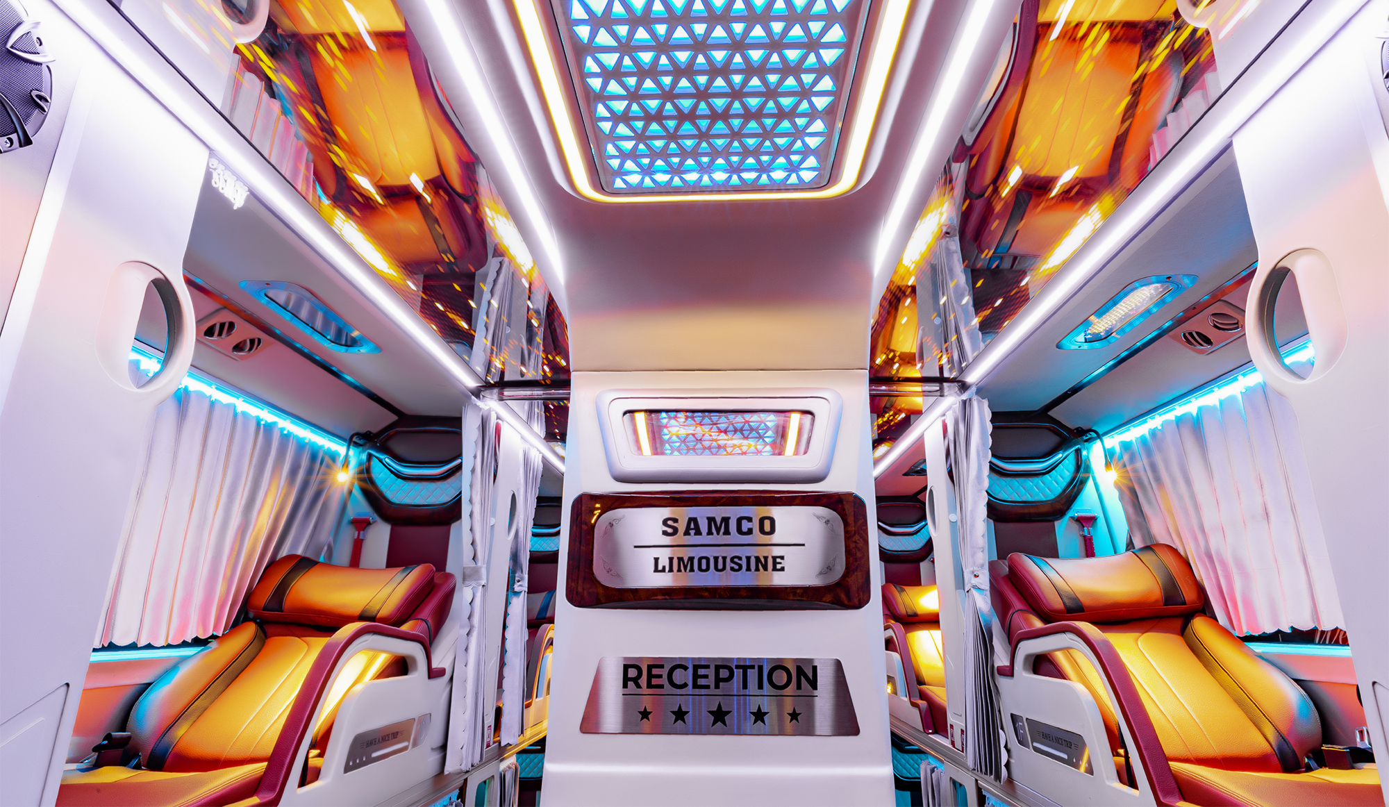 Nội thất Samco Primas Limousine sang trọng, bố trí 34 giường vip với mọi trang bị tiện nghi như LCD với thẻ nhớ 32G chứa nhiều chương trình giải trí hấp dẫn, tai nghe, đèn đọc sách, cổng sạc điện thoại và rèm riêng biệt...mang đến cho khách hàng một trải nghiệm hoàn hảo cho hành trình.