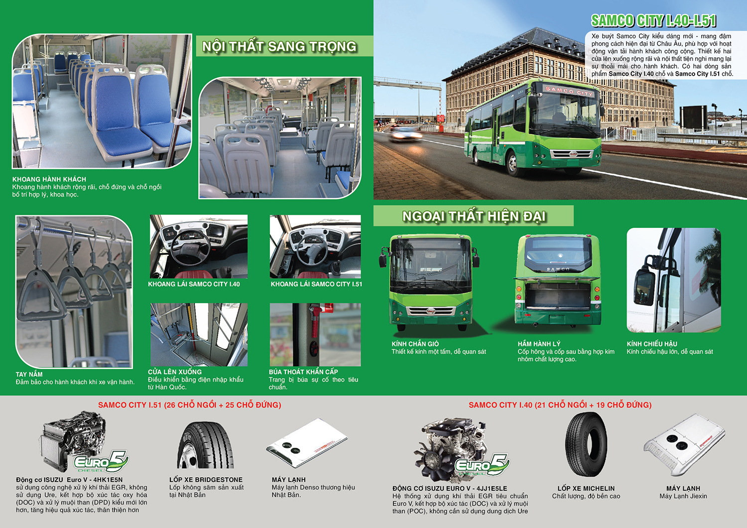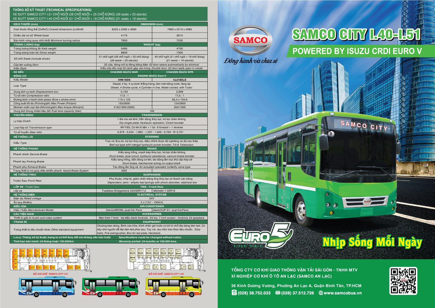 Samco City I.51 và Samco City I.55 sử dụng nhiên liệu Diesel, tiêu chuẩn khí thải Euro V - dòng xe buýt tầm trung duy nhất trên thị trường với sức chứa 51-55 người, sản phẩm được tin tưởng đầu tư phục vụ vận tải hành khách công cộng phổ biến tại các thành phố lớn như Hà Nội, Tp. Hồ Chí Minh... bởi tính hiệu quả và kinh tế cao.