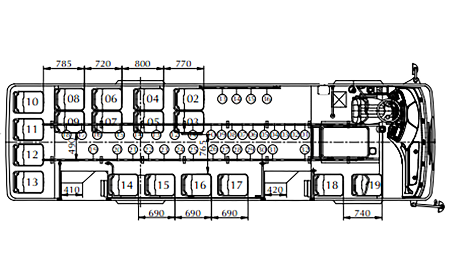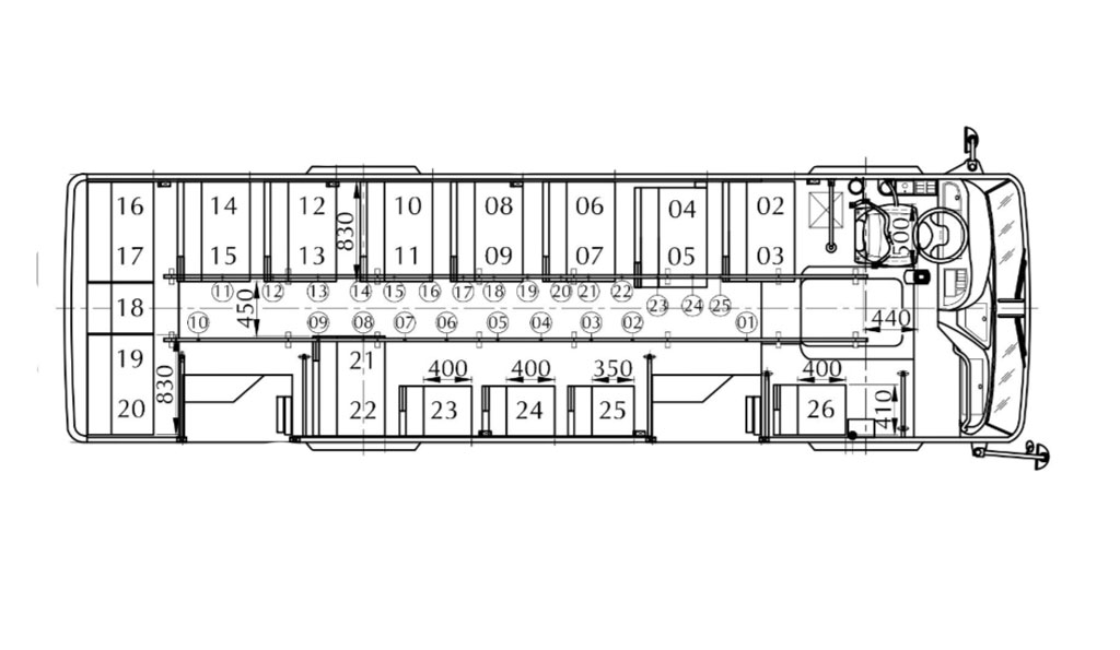51 chỗ (26 chỗ ngồi + 25 chỗ đứng) - 26seats + 25 stands 55 chỗ (19 chỗ ngồi + 36 chỗ đứng) - 19seats + 36 stands |