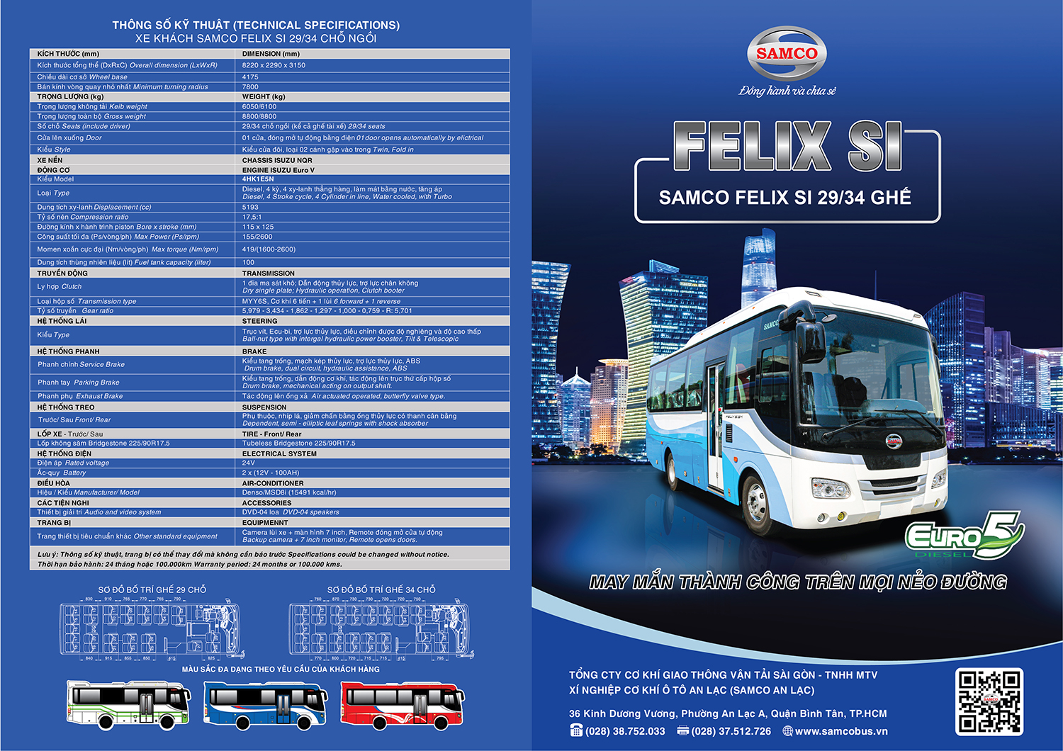 Xe khách Samco Felix 29/34 ghế là dòng xe tiêu biểu của thương hiệu Samco. Trang bị động cơ Isuzu 5.2 cực bền, mạnh mẽ và tiết kiệm nhiên liệu, xe mang lại lợi ích kinh tế cao, phục vụ hiệu quả, đa dạng loại hình vận tải tuyến, hợp đồng du lịch hoặc đưa rước CB.CNV, đã được rất nhiều doanh nghiệp vận tải đầu tư trên cả nước.