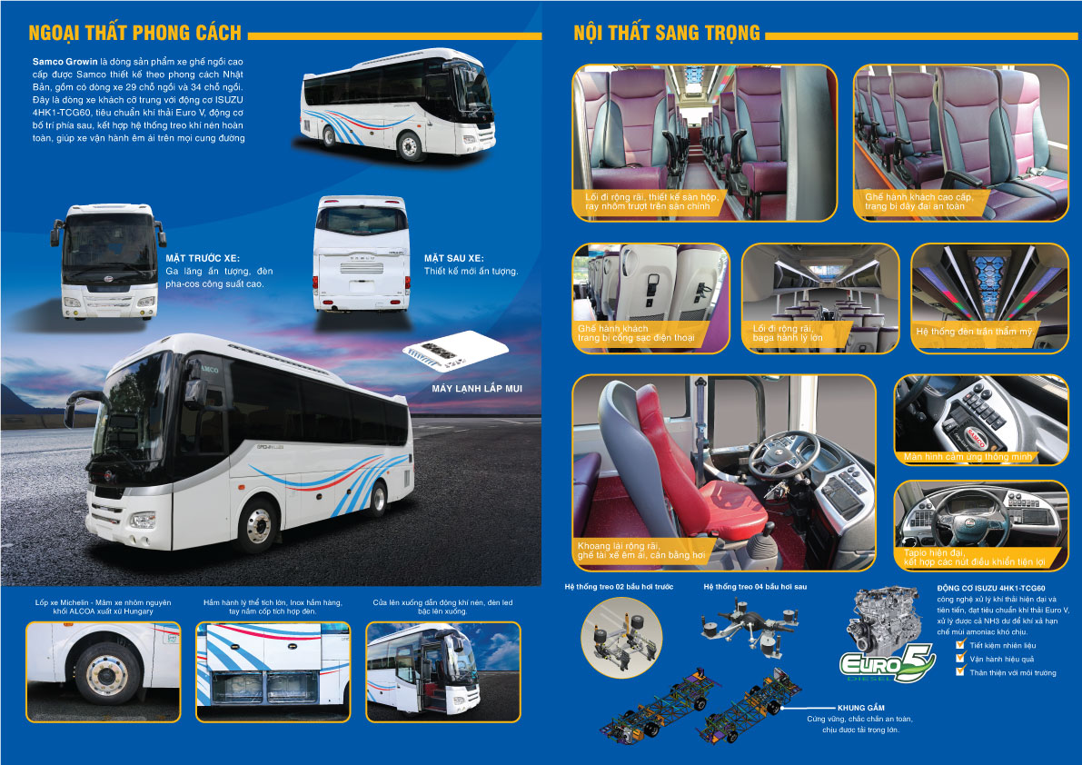 Đây là bước đột phá của dòng xe khách cỡ trung với động cơ ISUZU 4HK1-TCG60 Euro V bố trí phía sau, kết hợp hệ thống treo khí nén sử dụng 6 bầu hơi được ISUZU thiết kế đồng bộ với hệ thống khung gầm. Với thiết kế hiện đại, nội thất sang trọng, xe mang đến sự hài lòng cho mọi khách hàng.